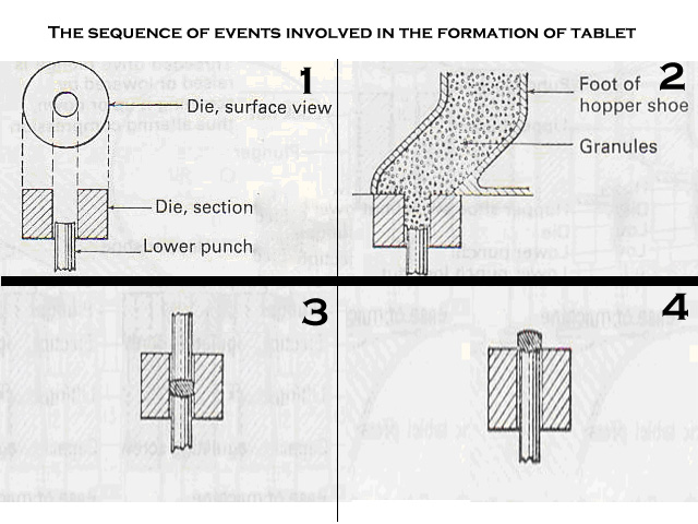 The sequence of events involved in the formation of tablets.